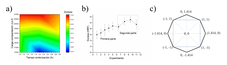 Figura 1. a) Mapa de contorno resultado de la etapa de sondeo inicial; b) gráfico de variación de dureza con cada paso, de la etapa de ascenso pronunciado; y c) diseño central compuesto planteado para la etapa de exploración local